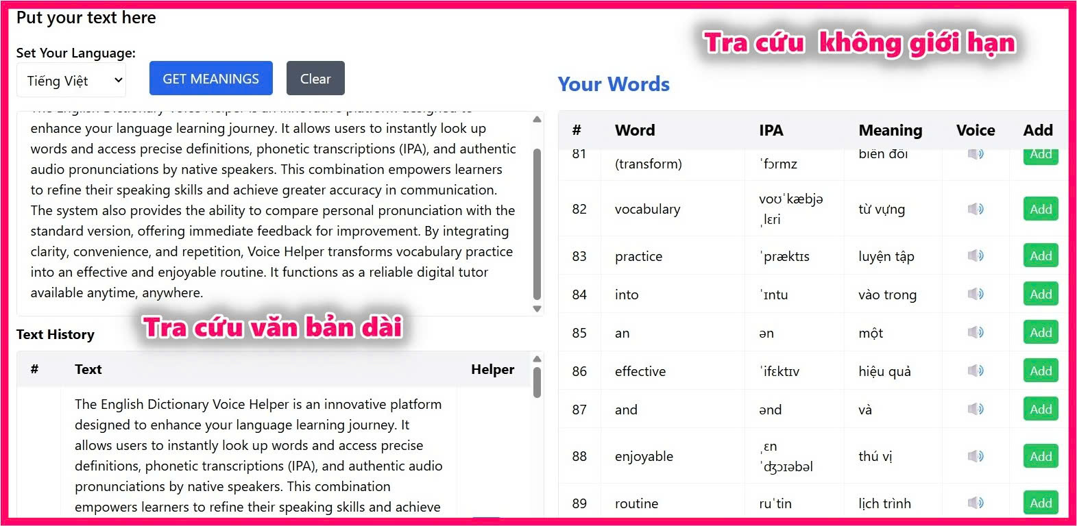 Voice Helper là từ điển Tiếng Anh kẻ hủy diệt mọi sự bất tiện. Thay vì mất thời gian tra từng từ một như thủ công, Voice Helper cho phép dán cả đoạn văn tiếng Anh và sẽ tự động phân tích thành từng từ vựng theo đúng thứ tự xuất hiện. Điều này giúp tra cứu nhanh hơn gấp nhiều lần, tiết kiệm tới 90% thời gian so với cách thủ công.